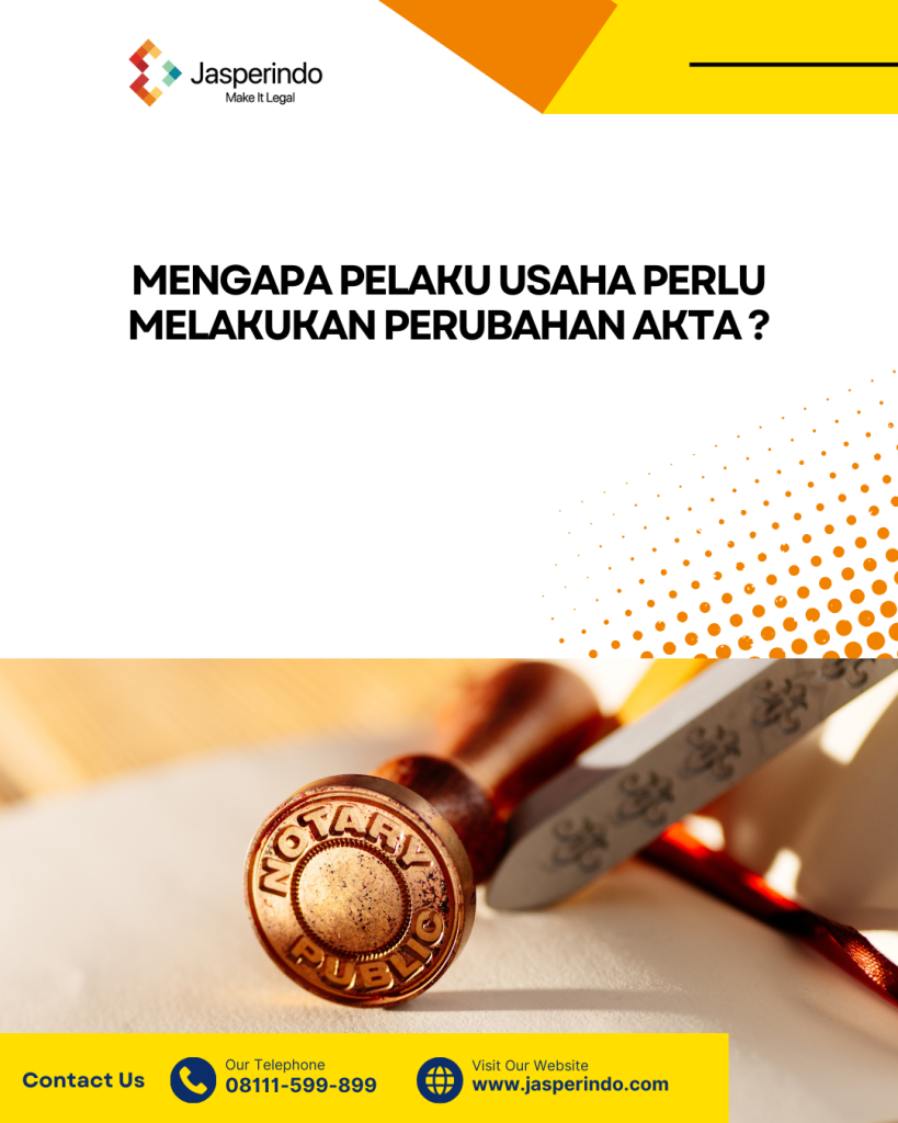 Pelaku usaha perlu melakukan perubahan akta perusahaan karena akta notaris adalah dokumen hukum utama yang mencatat identitas dan perubahan penting suatu badan usaha (PT, CV, Firma, Koperasi, dll). Berikut alasan mengapa perubahan akta perlu dilakukan: